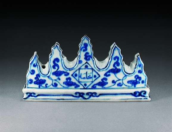 明代瓷制筆架以山形居多,有明確紀年的為正德時青花筆架,如青花纏枝靈芝阿拉伯文筆架,以雕塑技術(shù)成型,為五峰山狀,中峰略高,兩側(cè)山峰漸次。五峰以青花勾勒邊線,內(nèi)繪纏枝靈芝紋飾,中峰開光內(nèi)書有波斯文字。五峰山下為青花勾云紋。底有青花“大明正德年制”楷款。