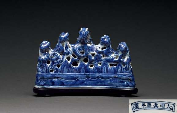 筆架也由最初的石質(zhì)發(fā)展為瓷質(zhì)。山形筆架為明代主流,峰數(shù)一般不過五峰。故宮藏明萬歷青花三龍紋筆架呈“山”字形,高10.1厘米,底徑15.5厘米。塑三條立行龍,中間正面龍怒目伸爪,兩側(cè)龍昂首呼應(yīng);鶠楹K录y,下呈彎月狀足。底長方框內(nèi)青花橫書“大明萬歷年制”六字楷書款。三龍紋筆架為萬歷官窯創(chuàng)新之作。