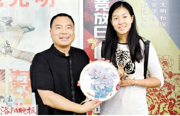 現(xiàn)場已等候多時的洛陽牡丹瓷創(chuàng)始人李學(xué)武,為段靜莉送上兩套限量版的牡丹瓷作品,一套紅花綠葉寓意花開富貴,一套淡紫牡丹國色天香。“牡丹瓷是洛陽有代表性的紀念品,曾作為國禮送給外國元首,段靜莉是咱洛陽人的驕傲,我今天把這份特殊禮物送給段靜莉,最美麗的花,送給最美麗的人。”李學(xué)武笑著向段靜莉展示這份禮物。