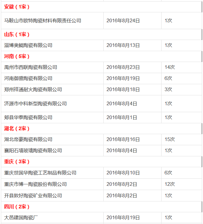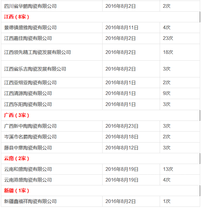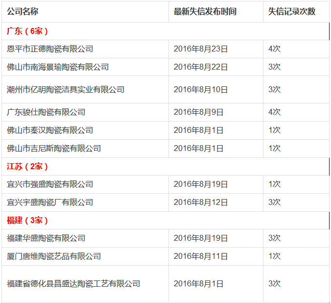 據(jù)最高人民法院及各地法院發(fā)布的失信被執(zhí)行人信息統(tǒng)計(jì),2016年8月,全國(guó)各地約有30余家陶瓷企業(yè)上榜“失信被執(zhí)行人”名單,原因主要為欠款不還,大部分為拖欠供應(yīng)商貨款、拖欠工資、欠銀行貸款未還以及拖欠融資租賃租金等,有企業(yè)失信金額大,已超千萬(wàn)元。其中,不少陶企有重復(fù)失信記錄,最多者竟達(dá)20余次。
