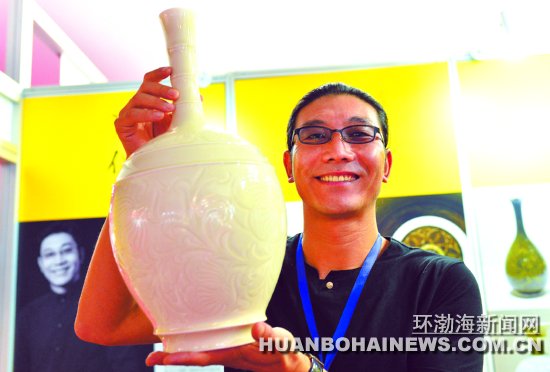 薛行嶙是70后,灤南人,梳著個長辨子,頗有藝術家的風范。他畢業(yè)于河北省輕工業(yè)學校,目前在河北曲陽任定瓷研究所所長,還開辦了一家公司。他的獲獎作品是一個白釉剔花紙槌瓶,薛行嶙介紹說,這個瓷瓶有3個特點,一是剔花工藝精美、刻工精湛;二是釉色溫潤,體現(xiàn)了定窯白釉的優(yōu)點;三是造型獨特,是他的原創(chuàng)。