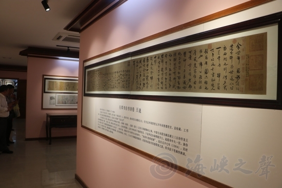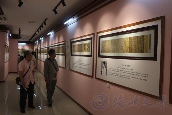 記者在現(xiàn)場(chǎng)注意到,全館面積并不寬敞,僅800余平方米,但光鮮亮麗,視野開(kāi)闊,洋溢著中華經(jīng)典書(shū)法藝術(shù)的氣韻和魅力;積淀深厚,古色古香,綻放著千年中華文明燦爛的精湛和光華。全館有“兩晉南北朝名家書(shū)法”、“隋唐五代名家書(shū)法”、“兩宋名家書(shū)法”、“元代名家書(shū)法”、“明代名家書(shū)法”、和“清代名家書(shū)法”六個(gè)陳列部分。每一部分精選的名家作品,都是千古傳世的經(jīng)典名篇。如西晉陸機(jī)的《平復(fù)帖》,是傳世最早的名家紙本書(shū)法墨跡。東晉王珣的《伯遠(yuǎn)帖》,為乾隆“養(yǎng)心殿”之“三希堂”中,三件晉人墨寶中唯一一件晉人真跡。又如800多年前,宋徽宗趙佶的《草書(shū)千字文》,原作長(zhǎng)達(dá)三丈余,筆勢(shì)凌空多變,一氣呵成,猶如長(zhǎng)江奔騰,一瀉千里。用八塊瓷板制作,全長(zhǎng)1172厘米。經(jīng)臨摹那遒勁的筆力、瀟灑的氣度,那紙的質(zhì)感、筆的動(dòng)感、墨光鑒影、云龍圖案、水跡塵痕,宛然在眼,纖毫畢現(xiàn)。