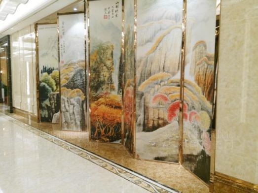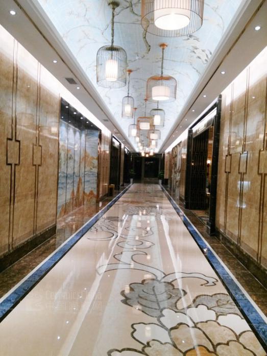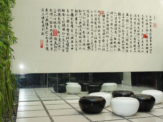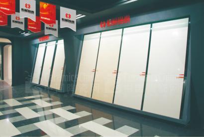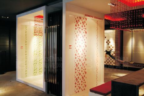 新展廳大量運用了中國山水瓷藝畫、中式屏風(fēng)、青銅鳥籠燈、不銹鋼窗格等元素來展示瓷磚的藝術(shù)殿堂。走進(jìn)面積達(dá)250平方的中空大堂,左右兩邊的中國山水瓷藝畫相互輝映,加上不銹鋼窗格在旁點綴裝飾,整個大堂格調(diào)高雅,氣勢蓬勃。