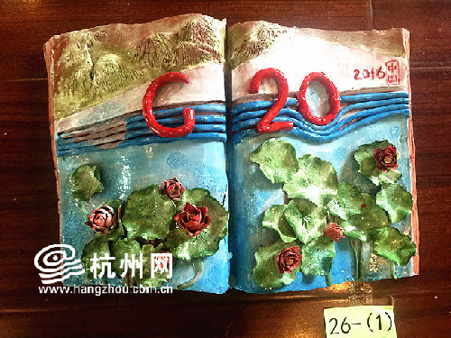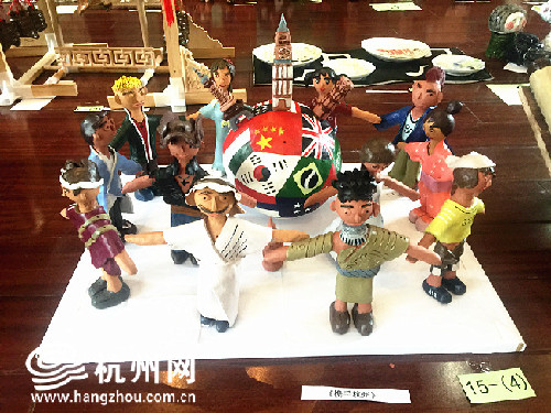 學生們通過一塊塊平凡的泥土,用自己的一揉一捏,在火的錘煉下幻化成意趣生動的陶藝作品,不少作品都充滿著各種中國元素、杭州民俗,如民族藝術(shù)、傳統(tǒng)節(jié)日、西湖美景、百姓生活等等,寄托了學生對G20的美好期待。就如一等獎作品《舌尖上的中國》,主題圍繞杭州飲食文化,用泥土的質(zhì)感和熟練的技巧將杭州特色美食小籠包,及傳統(tǒng)節(jié)日美食——中秋月餅、端午粽子表現(xiàn)的活色生香。這幅作品展出以來就成為了焦點,受到了“明星”待遇,栩栩如生的刻畫還勾起了不少參觀者的食欲。此外,西湖荷花、三潭印月、飲茶等杭州元素與埃菲爾鐵塔、峰會20國國旗、各國人物等世界文化的結(jié)合,充滿奇思妙想的作品都表達出小作者對G20杭州峰會的美好憧憬。