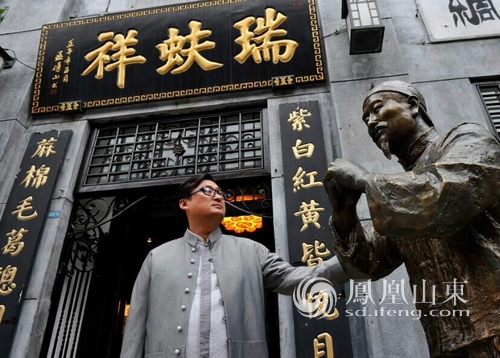 下午,鳳凰全媒體走進(jìn)周村大街,體驗(yàn)古代商業(yè)街文化,探尋魯商源地時(shí),恰逢孟洛川第五代孫孟慶鋼在周村大街新開(kāi)了一家“孟洛川”旗袍訂制門店,位置就在瑞蚨祥老號(hào)里。