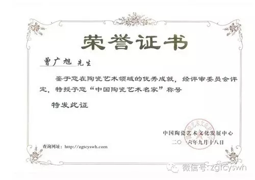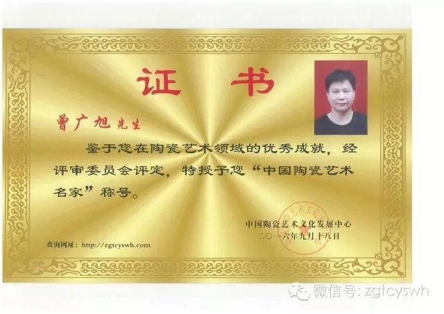 曾廣旭: 現(xiàn)為國(guó)家級(jí)高級(jí)工藝美術(shù)師。中國(guó)陶瓷藝術(shù)文化發(fā)展中心會(huì)員,作品《柴燒天目盞》在2016年中國(guó)國(guó)際(北京)陶瓷藝術(shù)名家精品展被評(píng)為“金獎(jiǎng)”。 2016年經(jīng)中國(guó)陶瓷藝術(shù)文化發(fā)展中心評(píng)審委員會(huì)評(píng)定為“中國(guó)陶瓷藝術(shù)名家”。
