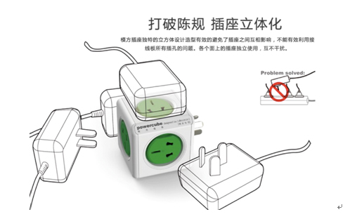 隨著手頭不斷增加著的電子設(shè)備,我們經(jīng)常被各種插頭在插排上“打架”的現(xiàn)象困擾——尺寸不一的充電器無法共存,不能有效利用插座接口。PowerCube(模方插座)的出現(xiàn)就像是插座界的一陣清風(fēng),顛覆傳統(tǒng)排插的外觀設(shè)計(jì),它的每一面都可以被充分利用,避免了傳統(tǒng)排插插頭間互相打架的尷尬局面,為插座界帶來了一種全新的洪荒之力。該產(chǎn)品2014年獲得德國紅點(diǎn)設(shè)計(jì)獎(jiǎng),其設(shè)計(jì)公司阿樂樂可工業(yè)設(shè)計(jì)有限公司,是一群由荷蘭代爾伏特理工大學(xué)工業(yè)設(shè)計(jì)畢業(yè)生們成立的創(chuàng)意設(shè)計(jì)公司,以模方插座的設(shè)計(jì)產(chǎn)品風(fēng)靡全球。