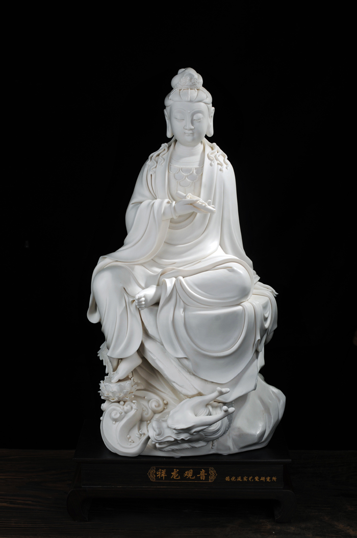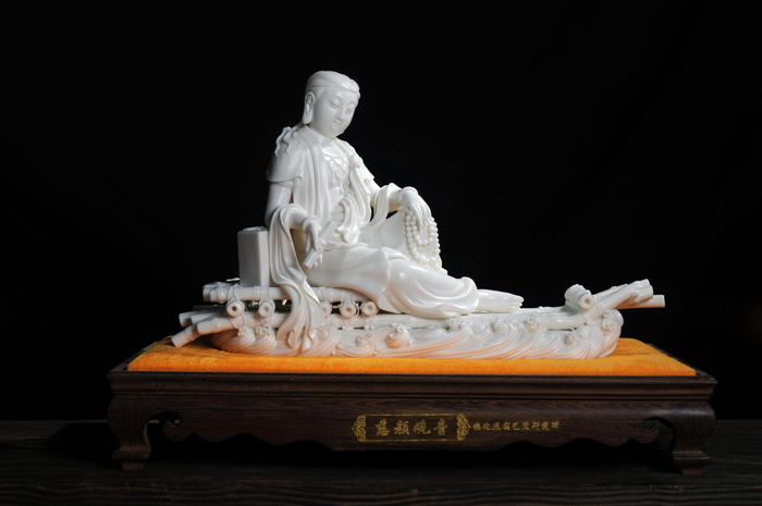 觀音神態(tài)莊嚴(yán)安和,慈悲吉祥,雕工精致,特別難得的是底部竹排造型,其雕刻燒制工藝難度高,成品率低。本尊作品具有獨(dú)創(chuàng)性、創(chuàng)新性,構(gòu)思巧妙,富有時(shí)代感,以德化瓷藝、竹排、觀音等元素,彰顯上善若水、普渡慈航的觀音文化,宣揚(yáng)一帶一路的海絲文化和海洋文化,祈福護(hù)佑共圓中國(guó)夢(mèng)。作品限量99尊,具有極高的收藏價(jià)值。2015年7月3日被福建中國(guó)閩臺(tái)緣博物館永久收藏; 2016年1月獲中國(guó)國(guó)際(北京)陶瓷藝術(shù)名家精品展‘金’獎(jiǎng)。