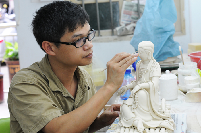 陳廷實(shí)先后師從數(shù)位瓷塑大師,經(jīng)過10多年的苦心學(xué)藝,精通拉坯、塑像、雕刻、燒窯等高難技術(shù),期間除了閱讀大量的宗教、陶瓷、藝術(shù)類書籍,還四處拜訪名師。所創(chuàng)作作品以觀音、彌勒和古代神像為主,作品造型務(wù)實(shí)、嚴(yán)謹(jǐn)、質(zhì)感強(qiáng)烈,并恰當(dāng)?shù)剡\(yùn)用了線條在瓷雕中的表現(xiàn)力,結(jié)合德化陶瓷“白”、“潤(rùn)”、“飽滿”等特性更好地加以展示,從立意到表現(xiàn)手段,在繼承傳統(tǒng)制作工藝基礎(chǔ)上敢于創(chuàng)新。寶劍鋒從磨礪出,梅花香自苦寒來,經(jīng)過二十多年的學(xué)習(xí)創(chuàng)作,陳廷實(shí)作品多次在評(píng)比大賽中榮獲金、銀、銅獎(jiǎng),被數(shù)家博物館、名寺院收藏,深受廣大陶瓷藝術(shù)愛好者喜愛。