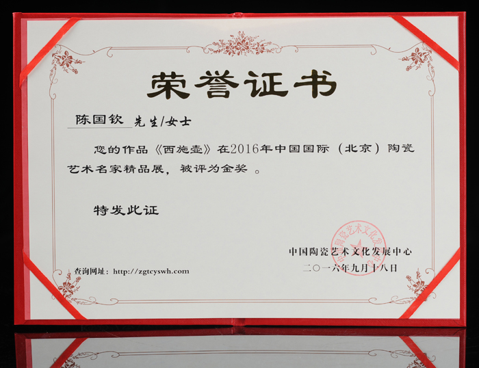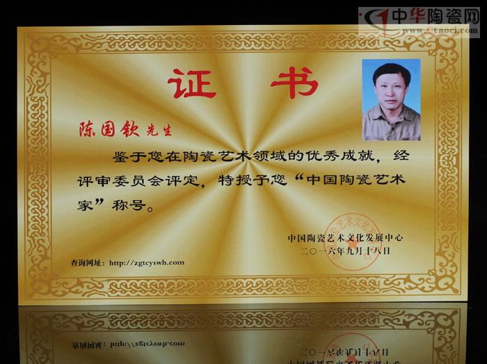 2016年9月,鑒于陳國欽在我國陶瓷藝術領域取得的突出成就,經中國陶瓷藝術文化發(fā)展中心評審委員會評定授予陳國欽“中國陶瓷藝術家”稱號。