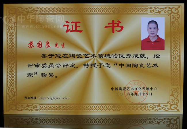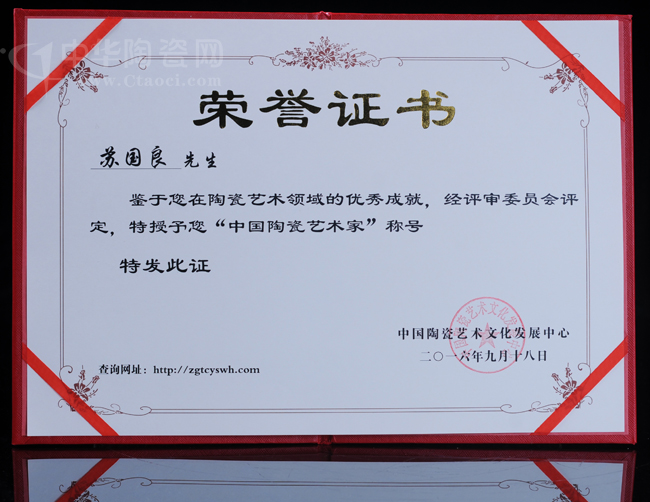 2016年9月,鑒于蘇國良在我國陶瓷藝術(shù)領(lǐng)域取得的突出成就,經(jīng)中國陶瓷藝術(shù)文化發(fā)展中心評審委員會評定授予蘇國良“中國陶瓷藝術(shù)家”稱號。