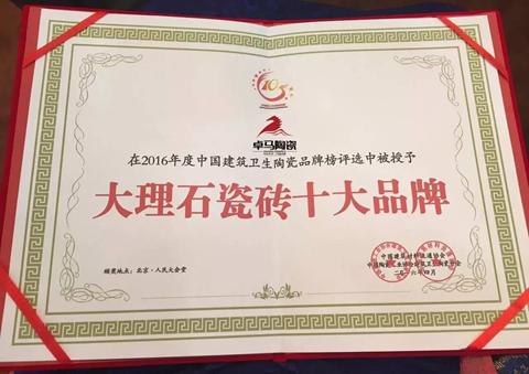 卓馬陶瓷“大理石瓷磚十大品牌”榮譽(yù)證書
