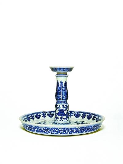 這件清乾隆早期“唐英自用青花纏枝花卉紋燭臺(tái)”,僅剩燭臺(tái)的上半部分,其底部蠟盤寬厚,口沿外撇,通過極富韻律感、線條起伏多變的圓柱與燈盞托盤相連。蠟盤與燈盞托盤為分段燒造,拼接組裝而成。燭臺(tái)胎質(zhì)細(xì)膩,釉汁晶瑩,通體紋飾以青花繪就,自頂端燈盞托盤至底部蠟盤內(nèi)外分繪回紋、蕉葉、雙犄牡丹、折枝蓮花、如意云頭、卷草朵花等多層紋飾,青花發(fā)色沉著,仿宣窯點(diǎn)染筆意濃重,頗具雍正遺風(fēng)。紋飾的布局和折枝蓮花的畫法帶有強(qiáng)烈的洛可可藝術(shù)風(fēng)格,說明此時(shí)唐英本人在瓷器紋飾的設(shè)計(jì)上也已經(jīng)充分接受了西洋藝術(shù)裝飾手法。