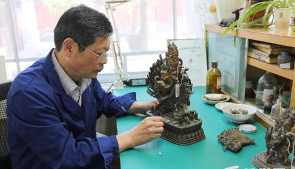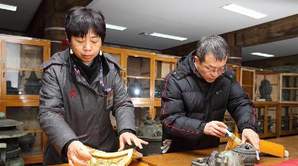 故宮工作人員修復(fù)文物(資料照片)。故宮博物院經(jīng)過三年藏品清理工作,增加了55132件登記藏品,涉及乾隆御稿、尺牘、甲骨、陶瓷等種類文物、標(biāo)本。這些新“上戶口”的藏品已于3月15日起在延禧宮展覽