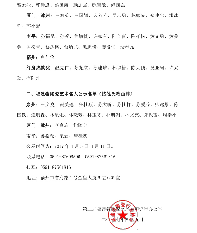 福建省陶瓷藝術(shù)大師、名人公示名單