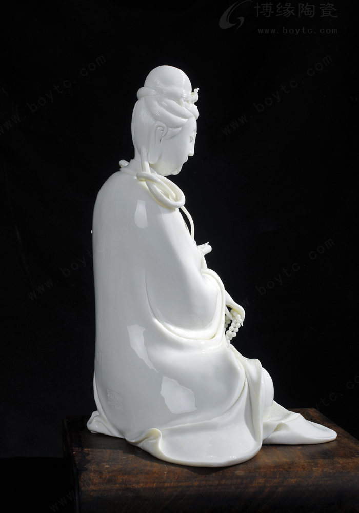 《持經(jīng)觀音》以德化特有的溫潤如玉的“中國白”為胎質(zhì),純手工制作,所塑人物性格鮮明,造型優(yōu)美,神態(tài)逼真,風(fēng)格洗練。