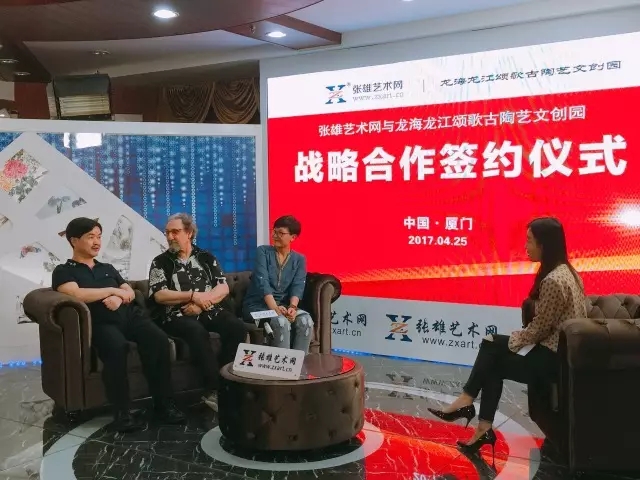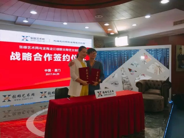 如何依托現(xiàn)有陶瓷資源,推動傳統(tǒng)陶藝傳承,為傳統(tǒng)陶藝發(fā)展找到出路,是龍海市人民一直思考的問題。為了更好地整合資源,讓互聯(lián)網(wǎng)與文創(chuàng)旅游產(chǎn)業(yè)進行深度融合,2017年4月28日,張雄藝術網(wǎng)與龍江頌歌古陶藝文創(chuàng)園達成戰(zhàn)略合作協(xié)議,雙方在張雄書畫院美術館二樓演播廳舉行了簽約儀式。