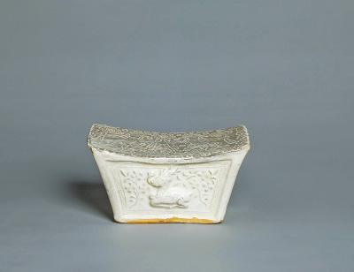 這件北宋鑲嵌人物枕,工藝十分復雜。褐色枕面上,白線勾勒出兩位戲曲人物,周圍裝飾著滿滿的花卉紋和祥云紋;枕的四周則是浮雕的花卉和小鹿圖案,做工極為細致美麗。
