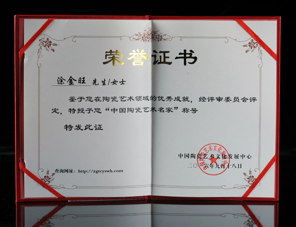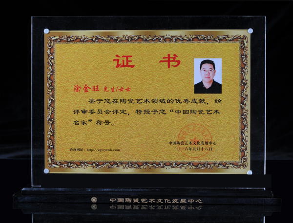 2016年9月,鑒于涂金旺在陶瓷藝術(shù)領(lǐng)域取得的突出成就,經(jīng)中國(guó)陶瓷藝術(shù)文化發(fā)展中心評(píng)審委員會(huì)評(píng)定授予涂金旺“中國(guó)陶瓷藝術(shù)名家”稱號(hào)