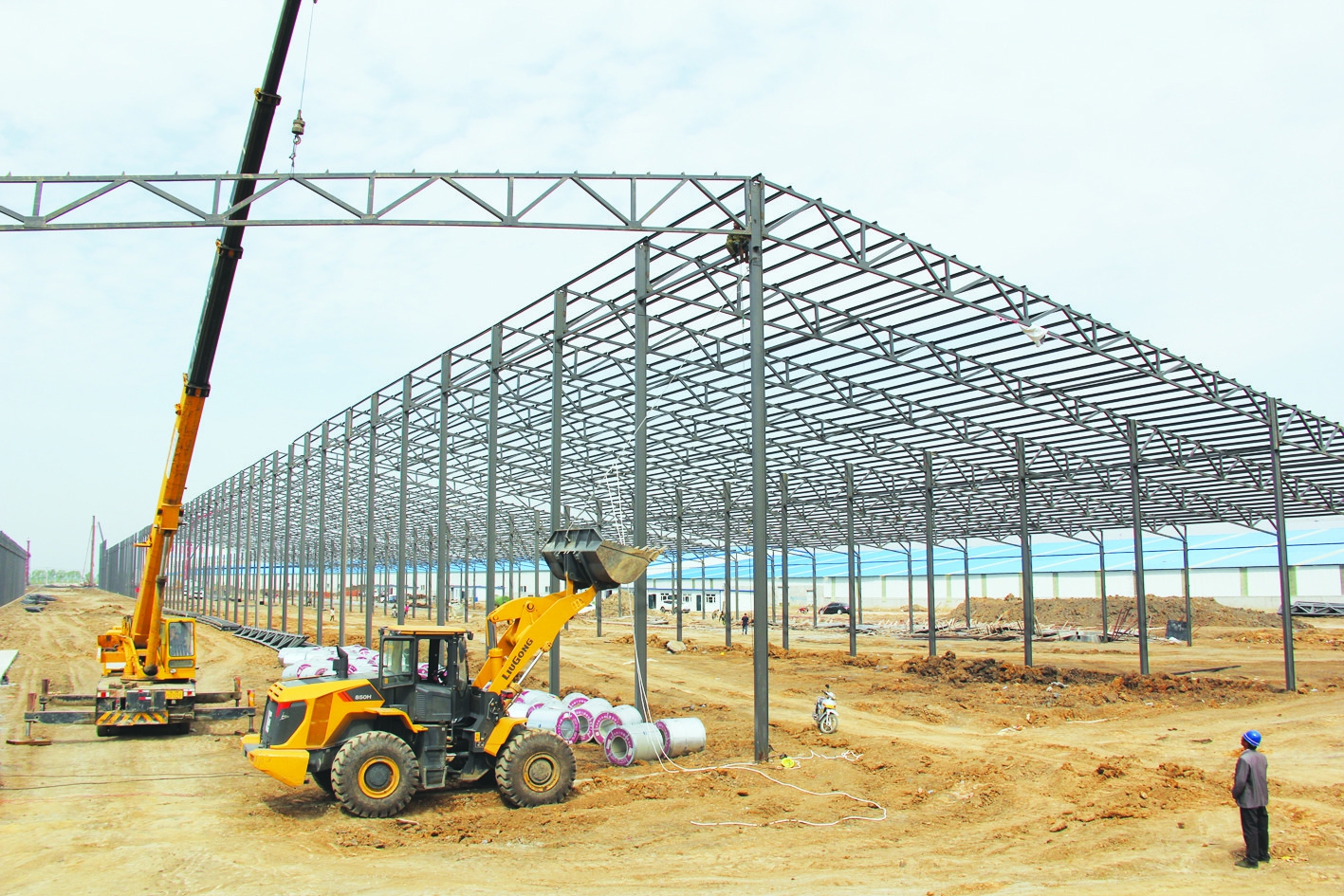 記者穿行于依安縣陶瓷產(chǎn)業(yè)示范基地,一處處塔吊林立的建筑工地、一座座現(xiàn)代化鋼結(jié)構(gòu)的廠房車(chē)間,一個(gè)個(gè)產(chǎn)業(yè)集聚的工業(yè)園區(qū),匯集成陶瓷產(chǎn)業(yè)重點(diǎn)項(xiàng)目建設(shè)的滾滾熱潮,充溢著濃郁的發(fā)展氣息。而最吸引記者目光的,當(dāng)屬填補(bǔ)了我市陶瓷產(chǎn)業(yè)地磚領(lǐng)域空白的經(jīng)緯瓷業(yè)高檔地磚項(xiàng)目。在園區(qū)管委會(huì)工作人員的陪同下,記者來(lái)到項(xiàng)目施工現(xiàn)場(chǎng),只見(jiàn)成排豎立著的井字架、塔吊、工字鋼、腳手架,就像一片茁壯成長(zhǎng)的“鐵林”拔地而起。隨著大型吊車(chē)揮動(dòng)巨臂,一件件鋼結(jié)構(gòu)、設(shè)備就位;裝載著各種設(shè)備、物資的卡車(chē)穿梭在工地上,機(jī)器轟鳴聲、哨子聲、吆喝聲此起彼伏,匯聚成工地交響曲。