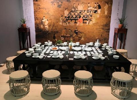 仿古瓷展區(qū)展出了包括宋景德鎮(zhèn)窯青白釉弦紋瓶、元青花魚藻紋大盤、明成化斗彩龍紋盤等200余件仿古精品,其中曾拍出2.3億天價的元青花鬼谷子下山大罐和2.8億港幣的明成化斗彩雞缸杯等高仿制品,維妙維肖,令人嘆為觀止。景德鎮(zhèn)的高仿瓷生產(chǎn)至少可以追溯到明代早期,如永樂御窯生產(chǎn)的仿龍泉青瓷,最典型的當屬明成化、清康雍乾三代大量的仿宋官窯、哥窯和龍泉窯瓷器。此次展覽主要集中的是元明清三代的高仿瓷,從景德鎮(zhèn)有影響力的仿古瓷生產(chǎn)廠家遴選而來。記者還注意到,展區(qū)內依據(jù)宋徽宗趙佶《文會圖》畫境布設的仿古青白瓷茶會場景別具一格,充分顯示了中華瓷茶文化相通相融的極致風姿。