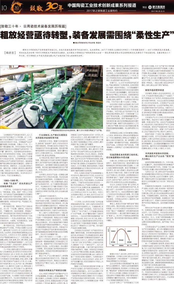 建陶與日用瓷的生產(chǎn)流程有諸多相通之處,在技術(shù)裝備發(fā)展歷程中既彼此獨(dú)立,也互相影響。2017廣州陶瓷工業(yè)展首次開創(chuàng)了一個新的展覽題材——2017日用陶瓷技術(shù)裝備展,同時這也是全球唯一針對日用陶瓷生產(chǎn)領(lǐng)域的專業(yè)展會。我們請來日用陶瓷生產(chǎn)領(lǐng)域的資深從業(yè)者——隆達(dá)骨質(zhì)瓷有限公司總經(jīng)理陳國忠先生撰寫了下面這篇專題,在展會創(chuàng)辦三十年之際,對日用陶瓷30年技術(shù)裝備發(fā)展以及產(chǎn)業(yè)現(xiàn)況做了深入的回溯與分析。