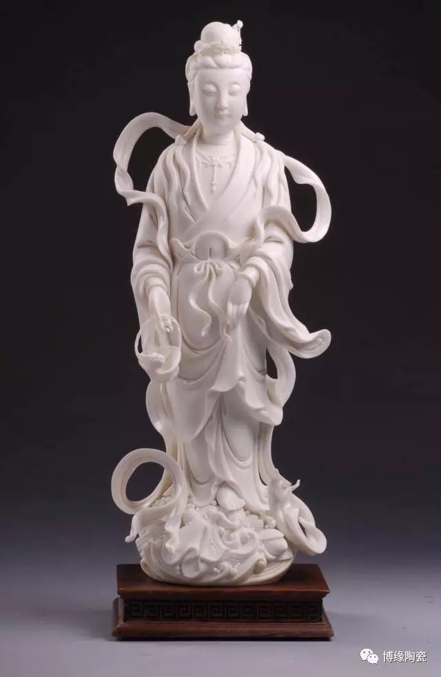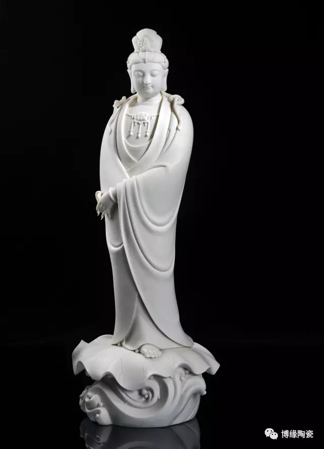德化瓷器,以白瓷為最;白瓷之中,又以佛像為最。德化白瓷所塑佛像有性格鮮明、造型優(yōu)美、神態(tài)逼真、風(fēng)格洗練的特點(diǎn)。有一種單純的雕塑美和原材料的質(zhì)地美,最能體現(xiàn)佛教樸素、平和的思想。早在明代德化白瓷佛像就名聲在外,一代“瓷圣”何朝宗佛像名作流傳后世,成為世界各大博物館收藏的珍品,更對(duì)佛像雕塑史上產(chǎn)生深遠(yuǎn)的影響,形成“何派”雕塑,其開創(chuàng)的捏、塑、雕、刻、刮、削、接、貼八字技法延用至今。何派觀音雕塑注重于細(xì)節(jié)之美,精益求精,故而十分著意衣紋的刻畫,使線條流暢,翻轉(zhuǎn)自然。觀其佛像,仿佛有春風(fēng)拂面,衣袂飄揚(yáng)的出塵之感。