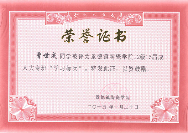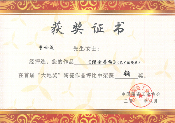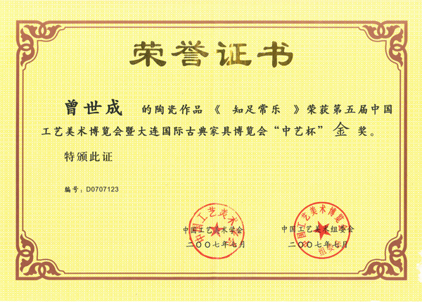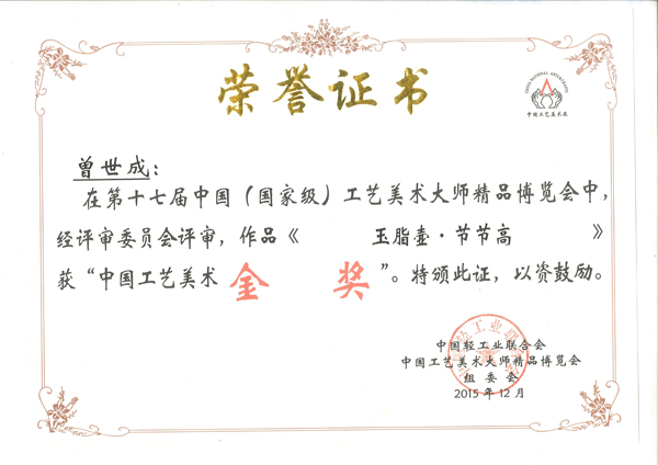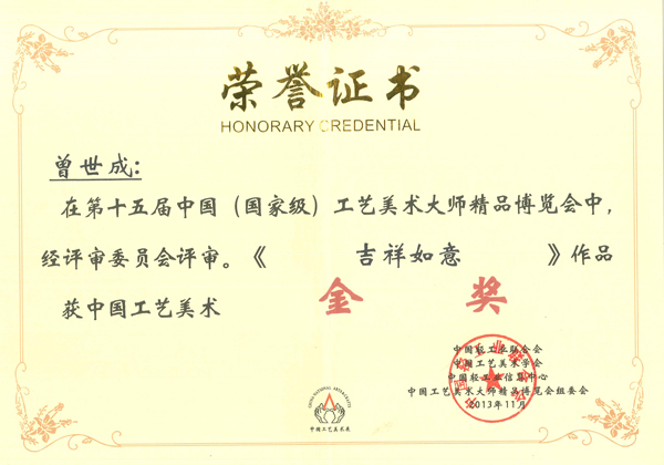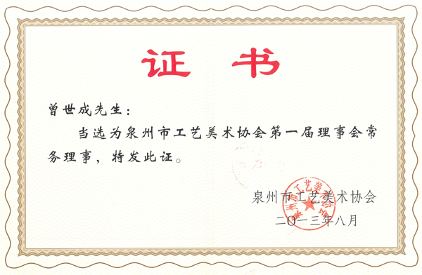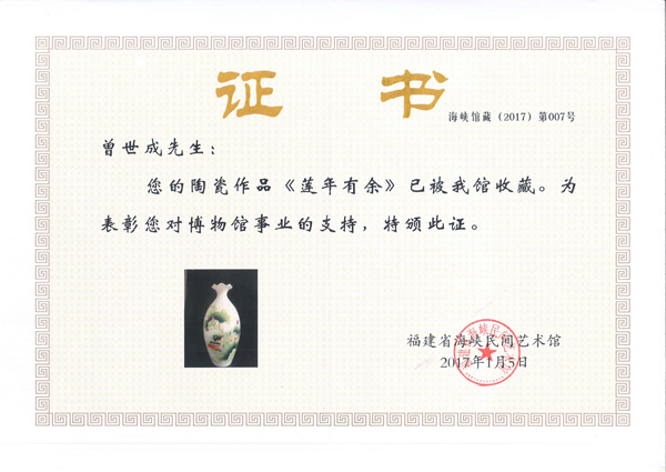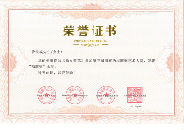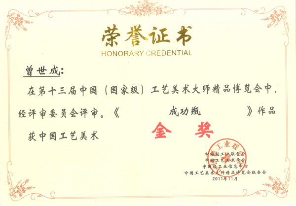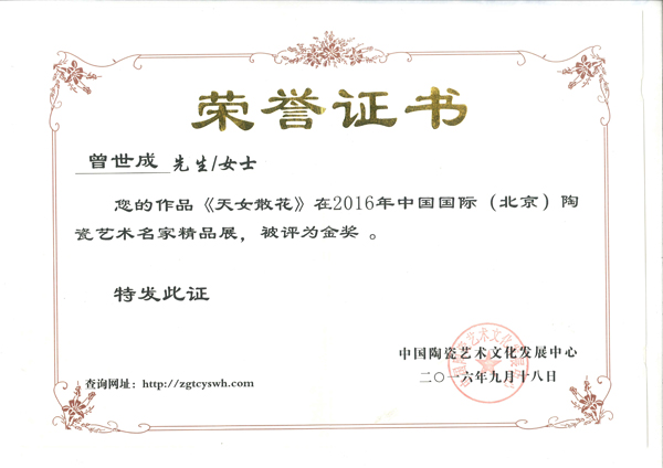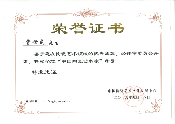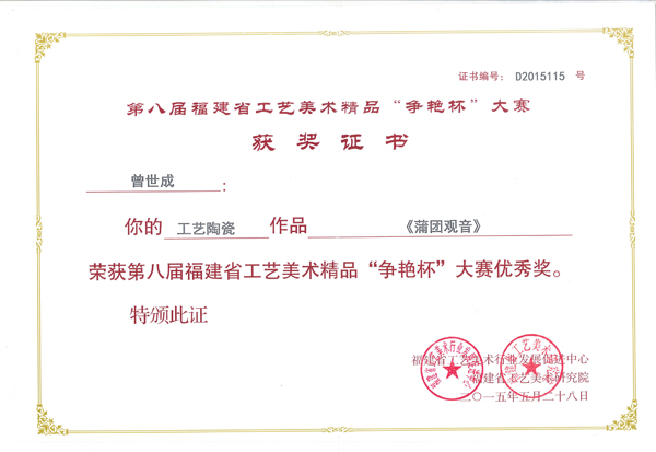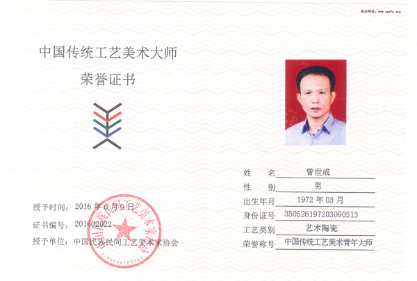 個(gè)人簡(jiǎn)介: 曾世成、男、漢族、祖籍福建省泉州市德化縣,1972年出生于中國瓷都,德化一陶瓷世家,從小深受陶瓷文化的熏陶。畢業(yè)于景德鎮(zhèn)陶瓷學(xué)院,中級(jí)工藝美術(shù)師,國家一級(jí)/高級(jí)技師、中國傳統(tǒng)工藝美術(shù)青年大師、中國陶瓷藝術(shù)家稱號(hào),2006年在北京“中國工藝美術(shù)學(xué)會(huì)高級(jí)研修班”進(jìn)修。其作品屢屢榮獲各種獎(jiǎng)項(xiàng)及被多家博物館收藏。