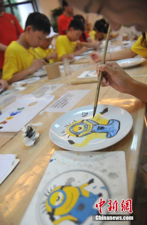 一位華裔青少年在一塊瓷盤上創(chuàng)作“小黃人”動畫形象。 劉占昆 攝
