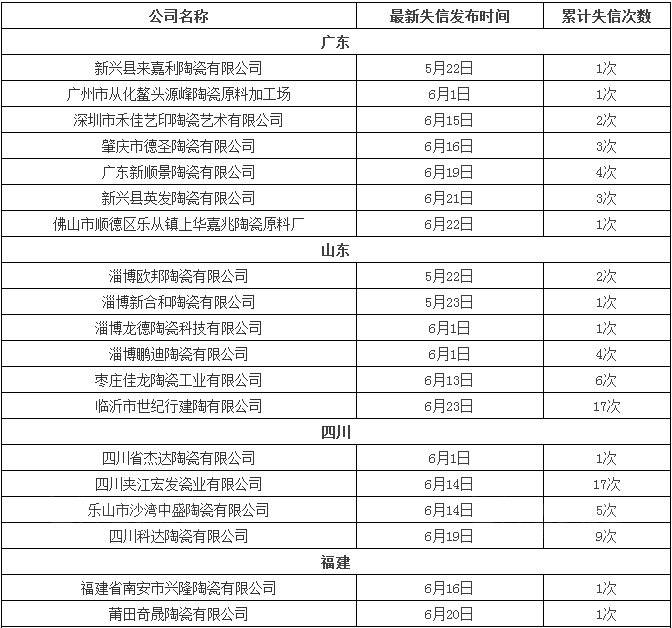 7月1日,記者根據(jù)最高人民法院及各地法院發(fā)布的失信被執(zhí)行人信息,統(tǒng)計(jì)了5月11日—6月30日這51天內(nèi)全國(guó)各地被列入“失信被執(zhí)行人”的陶企,14個(gè)省份的30余家陶瓷企業(yè)被列入了“老賴(lài)”名單。