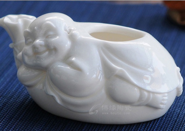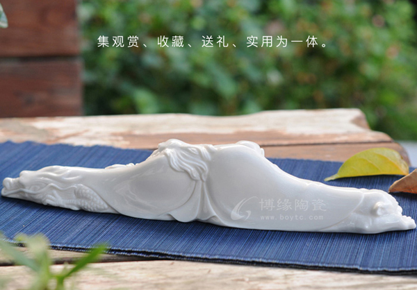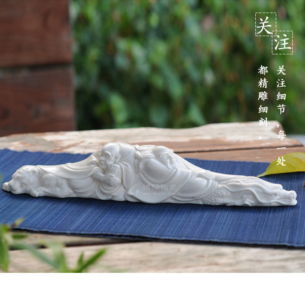 筆架把羅漢雕在筆架上,瓷架造型精美,獨(dú)特優(yōu)美,羅漢蠶眉彎曲、生動(dòng)傳神,閑逸自得、敦厚凝重的風(fēng)姿之中帶有逸秀瀟灑的氣韻。置于書(shū)房中,令人暇思無(wú)限,遠(yuǎn)念無(wú)窮。
