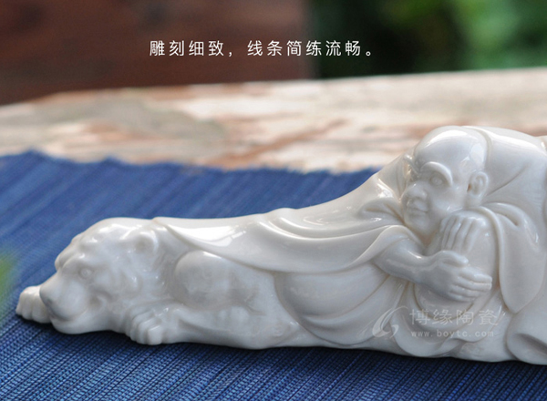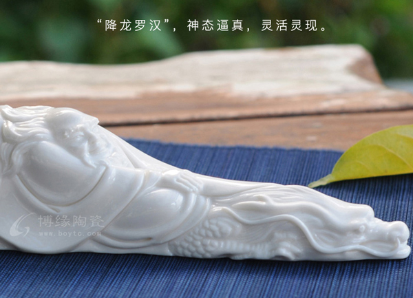 這套白瓷用品《十八羅漢文房四寶》是由福建省陶瓷藝術(shù)大師張祥琦傾心創(chuàng)作,十八羅漢為題材獨(dú)特新穎,采用德化優(yōu)質(zhì)“白瓷”為胎體,其含雜質(zhì)少,瓷質(zhì)潔白 ,瓷感細(xì)膩,其精湛的雕刻技藝和高超的文化造詣,用來(lái)佐助筆紙指點(diǎn)江山,激揚(yáng)文字,品藻人物,游戲山水,體現(xiàn)了精神貴族的優(yōu)雅與風(fēng)貌。