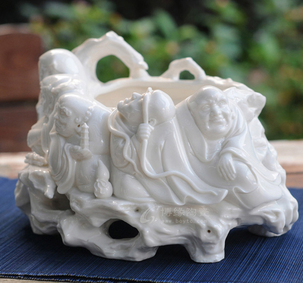 筆筒不規(guī)則筒狀,筆筒外壁透雕十八羅漢其中幾位神仙為為載體,白瓷質(zhì)地堅(jiān)硬雕塑的絕佳材料,而十八羅漢作為瓷器雕刻的理想題材,色澤光潤(rùn)明亮德白瓷充分發(fā)揮了雕刻者在十八羅漢題材的想象空間,更加突出白瓷的應(yīng)有價(jià)值,更彰顯出作品的文化氣息。