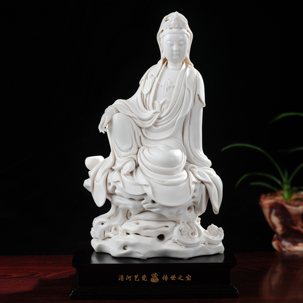 作品采用上等德化白瓷泥,經(jīng)1300多度高溫?zé),觀音一改佛教造像直立或打坐的成規(guī),右腿曲蹲,左腳盤坐巖石,重心落在左胯,右手悠然自在輕放于右膝之上,左手為支撐點(diǎn),無(wú)拘無(wú)束,自由自在。其姿態(tài)出色地突現(xiàn)了觀音流暢的線條和優(yōu)美的身段。