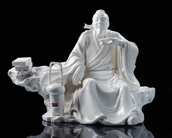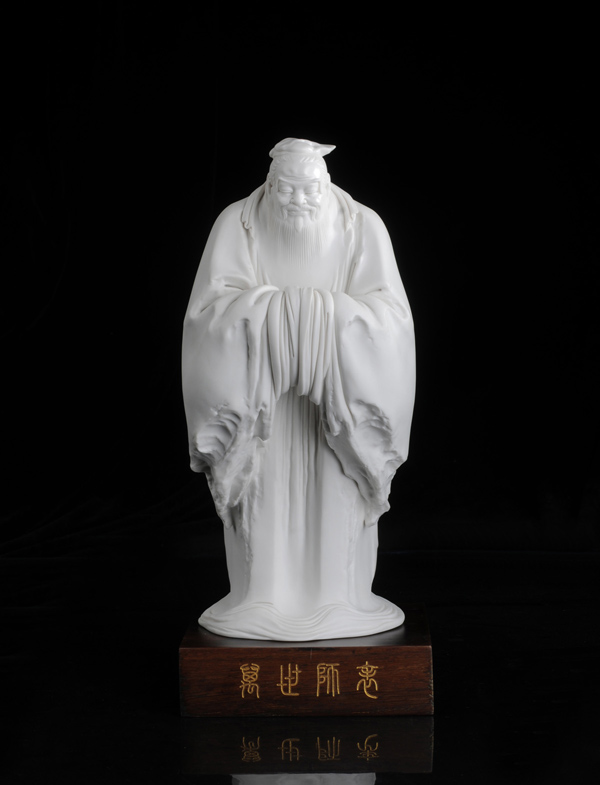 當(dāng)代德化實(shí)力派陶藝家鄭志德作品代表作品。作品以德化溫潤(rùn)如玉的“中國(guó)白”為胎質(zhì),手工制作,胎骨潔白,堅(jiān)實(shí)致密,有凝脂似玉之感?鬃由碇L(zhǎng)袍,面相莊重慈祥、沉靜肅穆。作品工藝精湛,衣紋流暢飄逸,體態(tài)豐隆,把孔子雕刻得活靈活現(xiàn),并與歷史記載中“溫而厲,威而不猛,恭而安”的形象吻合。