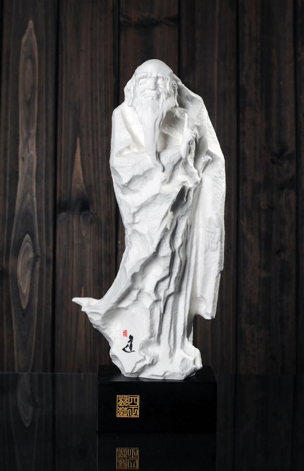 鄭志德代表作品,獲美國(guó)巴拿馬一百周年慶典優(yōu)秀藝術(shù)家作品獎(jiǎng),作品工藝精甚,大師手筆,化繁為簡(jiǎn),簡(jiǎn)約而不簡(jiǎn)單,臉上皺紋清晰自然,老子形象逼真?zhèn)魃瘛W髌犯挥袆?chuàng)意,以巖石為身,引申出并強(qiáng)調(diào)了老子的言論:道法自然。