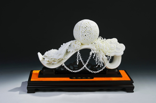 蘇志強(qiáng)的作品《圓滿如意》就是揉合中華傳統(tǒng)文化的元素,以如意棒為主體,圓球代表圓滿,蘊(yùn)含著“萬事如意”、“美美滿滿”的美好意象。作品純手工制作,精雕細(xì)刻,造型和諧,用璀璨的瓷花襯托柔軟鏈條的動(dòng)感,剛?cè)嵯酀?jì),松密結(jié)合,令人賞心悅目。作品并以德化特有的溫潤(rùn)如玉的“中國(guó)白”為胎質(zhì),潔白細(xì)膩,素凈淡雅。