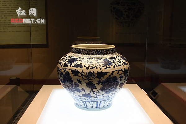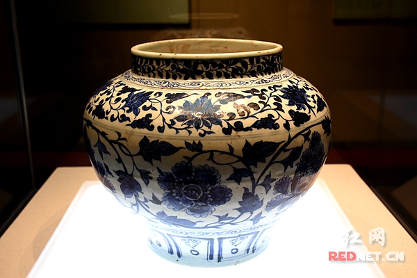 “元末纏枝牡丹紋青花瓷罐是我們的館藏一級(jí)文物,也是我們的鎮(zhèn)館之寶。”湘潭市博物館相關(guān)負(fù)責(zé)人介紹,這件館藏文物高28cm,口徑20cm,腹徑33cm,底徑18.3cm,其造型為元代罐類(lèi)中的飽滿型,即,腹徑長(zhǎng)于高度、罐直口、短頸、鼓腹、淺圈足、內(nèi)外施白釉、外壁以青花為飾,花紋繁密,由上至下分為五層:纏枝花葉、纏枝蓮花、纏枝牡丹、卷草、仰蓮瓣紋。“出淤泥而不染濯清漣而不妖。”愛(ài)蓮是君子所尚,蓮花象征純潔,牡丹是我國(guó)特有的木本名貴花卉,素有“國(guó)色天香”“花中之王”的美稱(chēng),長(zhǎng)期以來(lái)被人們當(dāng)作富貴吉祥、繁榮興旺的象征。元青花主要紋飾是纏枝牡丹,肩部的纏枝蓮與近底部的仰蓮,夾著中部主紋纏枝牡丹,寓意蓮生富貴。