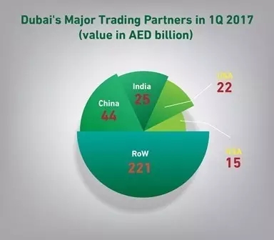 中國繼續(xù)保持迪拜最大貿(mào)易合作伙伴地位,貿(mào)易額441.5億迪拉姆,占迪拜總對外貿(mào)易額13.5%;印度以254億迪拉姆緊隨其后,占7.8%;美國以220億迪拉姆(占6.7%)位居第三。