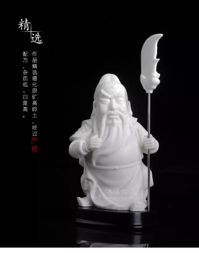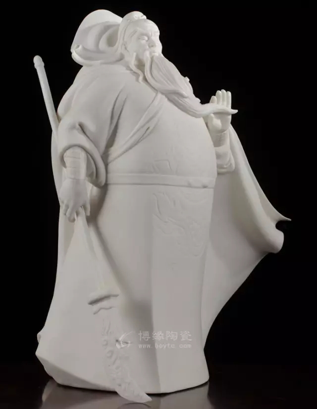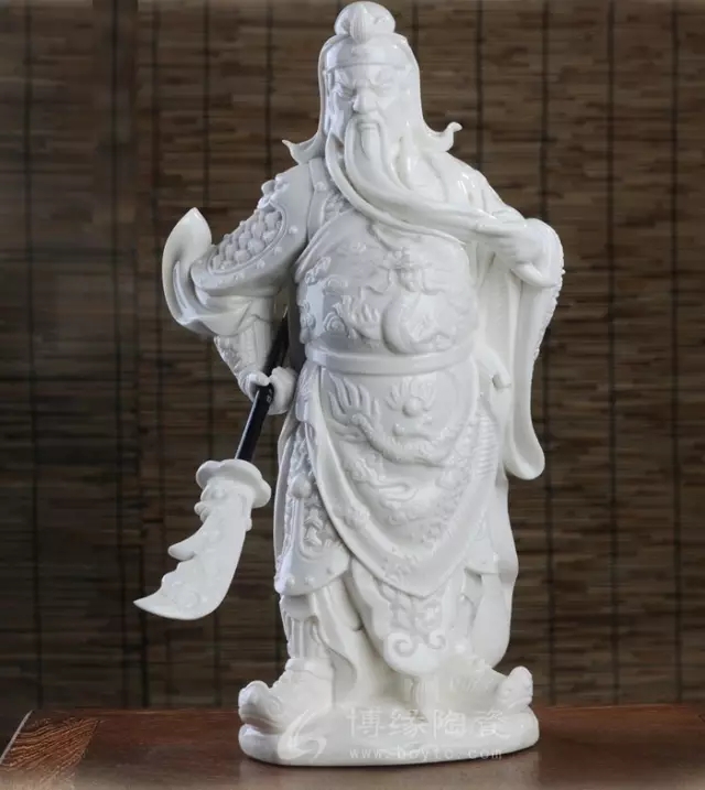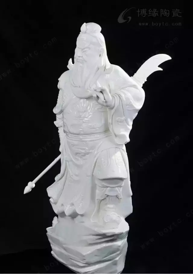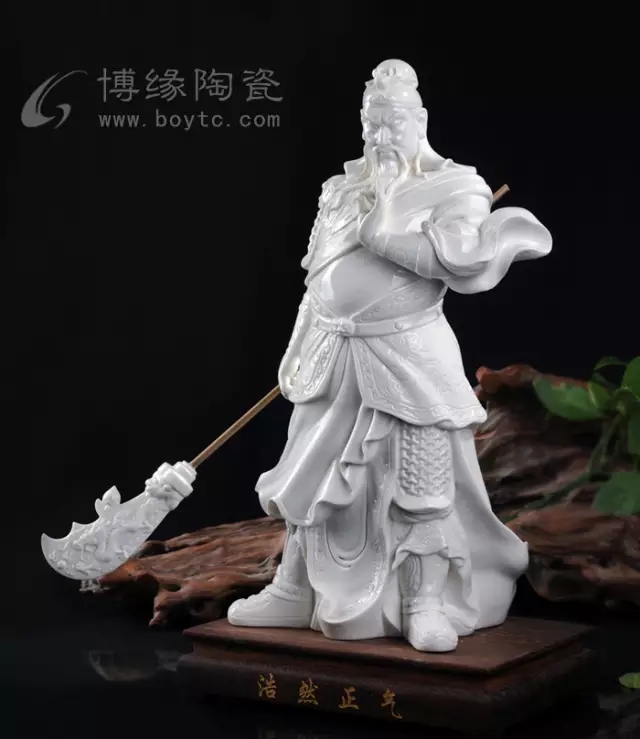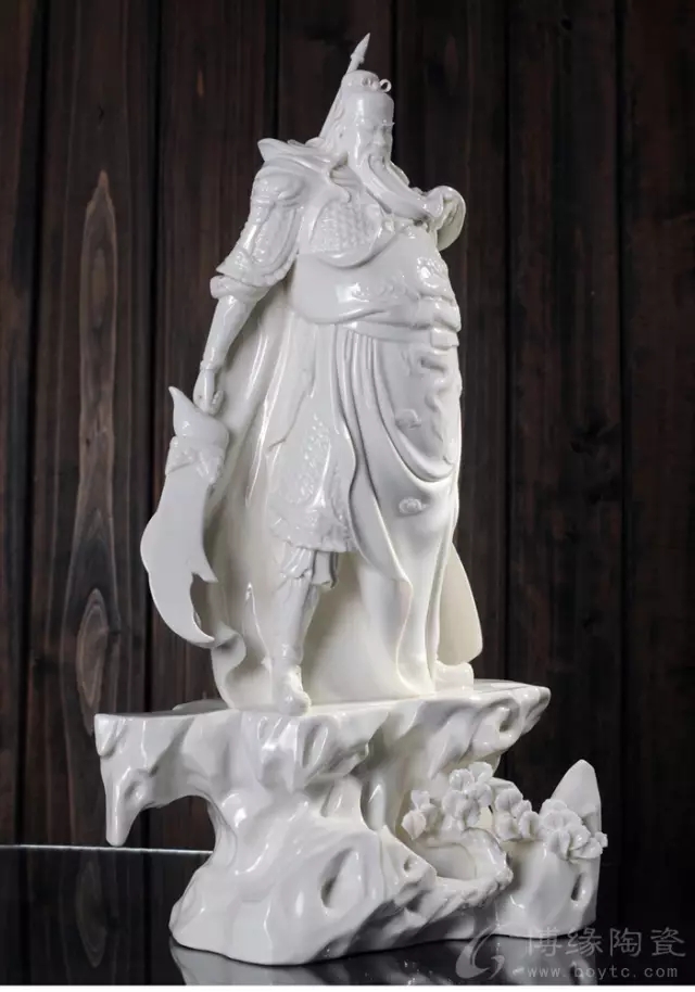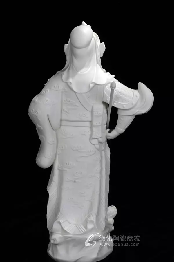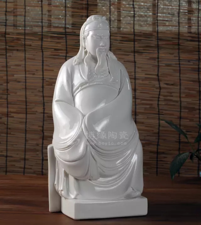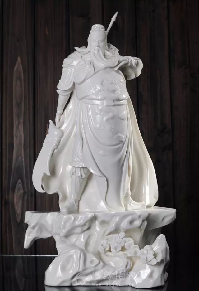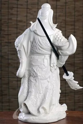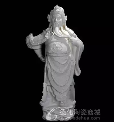 關(guān)公像是德化窯瓷塑藝術(shù)的常見題材之一。德化瓷塑在中國陶瓷史上久負(fù)盛名,它用優(yōu)質(zhì)的白瓷塑造神態(tài)各異的人物,以純凈瑩潤的釉色和生動(dòng)傳神的形象取勝,摒棄彩繪而追求單純的雕塑美和原材料的質(zhì)地美,獨(dú)具藝術(shù)風(fēng)韻。