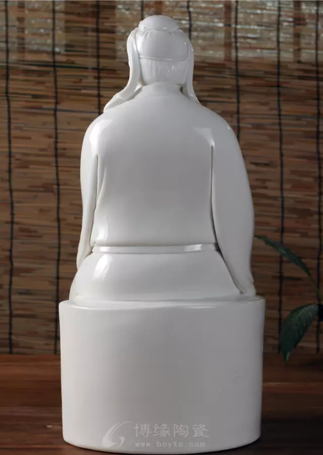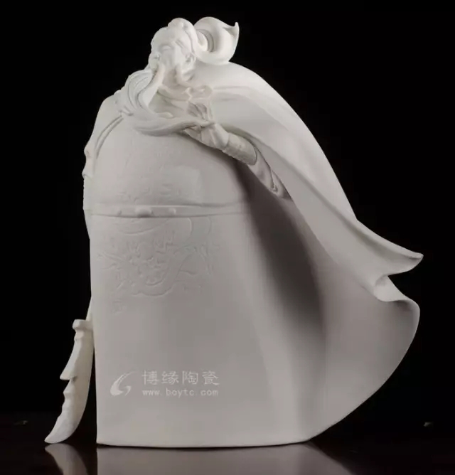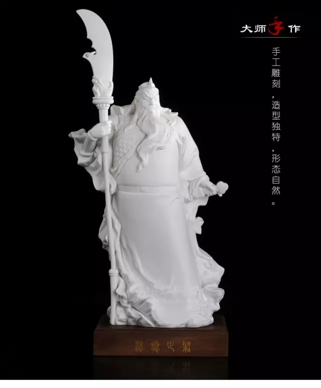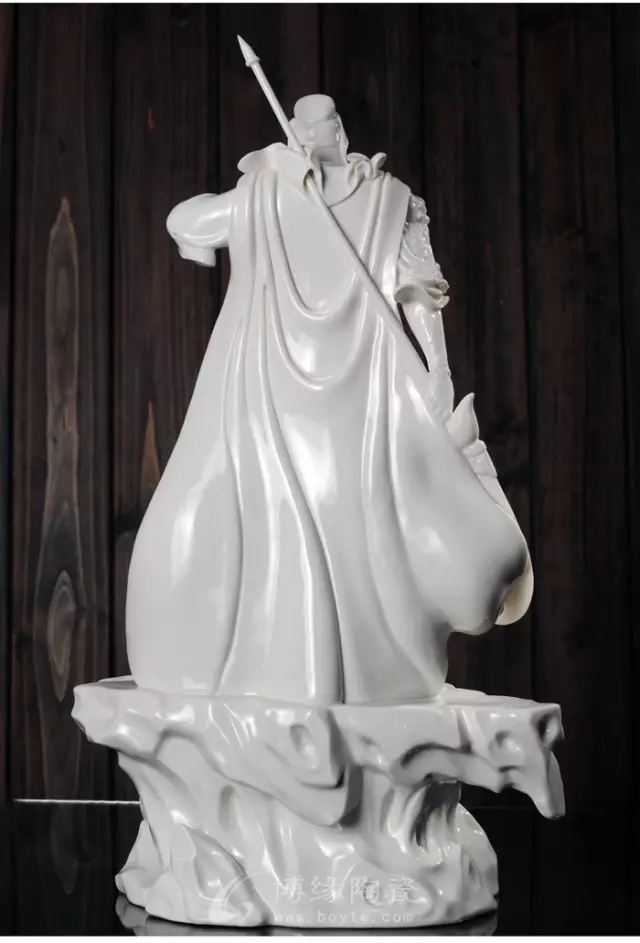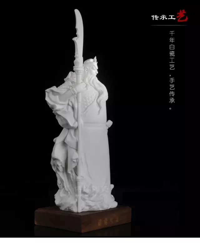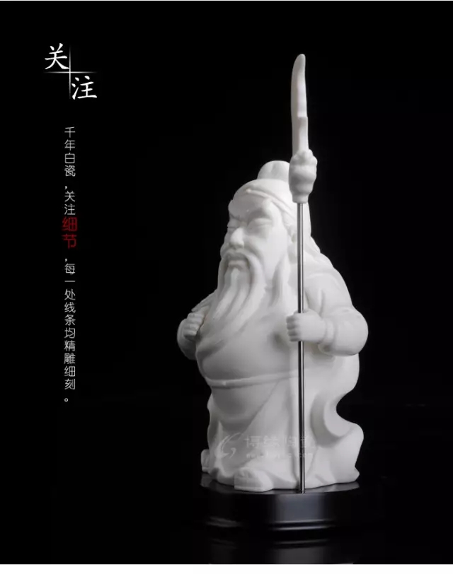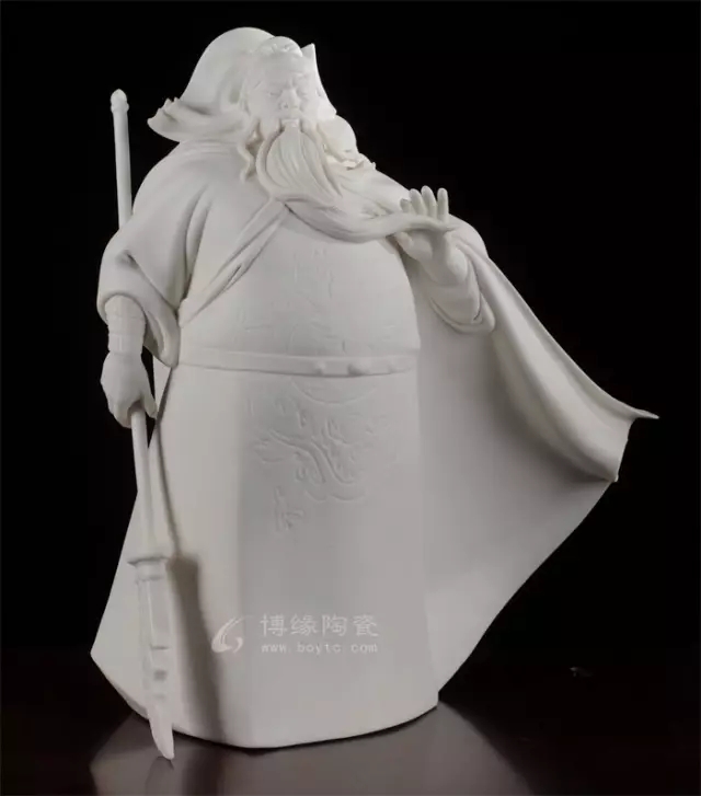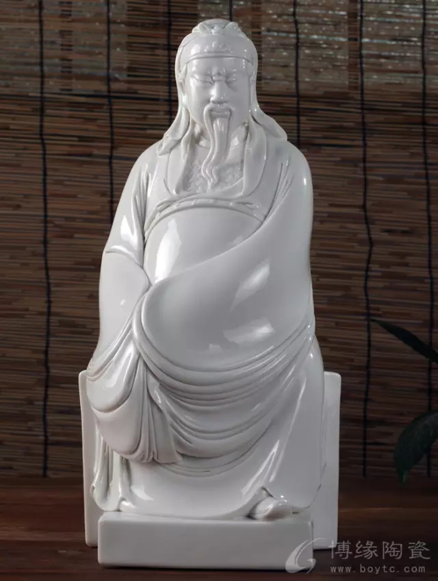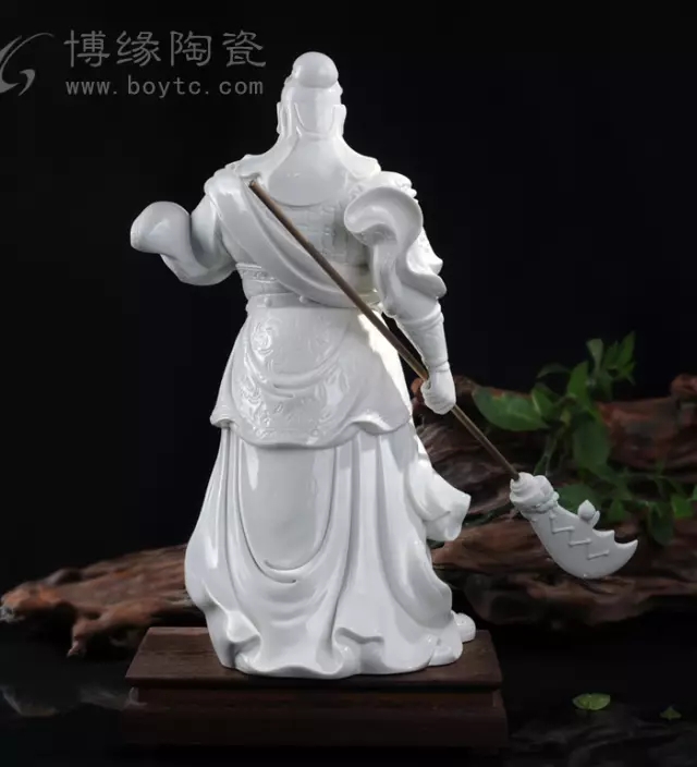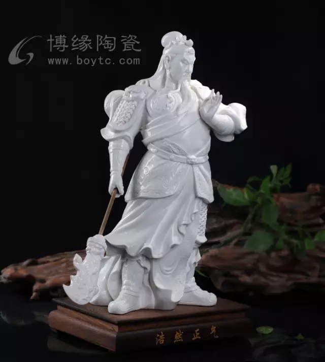 關(guān)公像是德化窯瓷塑藝術(shù)的常見題材之一。德化瓷塑在中國陶瓷史上久負(fù)盛名,它用優(yōu)質(zhì)的白瓷塑造神態(tài)各異的人物,以純凈瑩潤的釉色和生動(dòng)傳神的形象取勝,摒棄彩繪而追求單純的雕塑美和原材料的質(zhì)地美,獨(dú)具藝術(shù)風(fēng)韻。