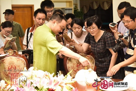中國網(wǎng)泉州訊(記者 胡光華 文圖)“哈!哈!哈!”9月14日,中國白陶瓷藝術(shù)館藝術(shù)總監(jiān)陳仁海一見到“異彩中國白”新聞采風(fēng)團(tuán)記者們前來,就緊緊握著中共德化縣委常委、宣傳部長陳堅(jiān)宏的手樂不可支地開心大笑,笑得非常爽朗,他的笑聲緣自該館研發(fā)制作的118套《四海同心》系列國宴瓷,成功躋身成為金磚國家領(lǐng)導(dǎo)人廈門會(huì)晤國宴餐具。