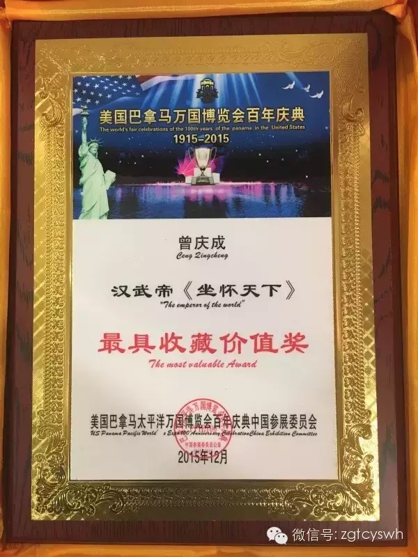 2015年,作品漢武帝《坐懷天下》在美國巴拿馬萬國博覽會(huì)百年慶典獲得“巴拿馬最具收藏價(jià)值獎(jiǎng)”