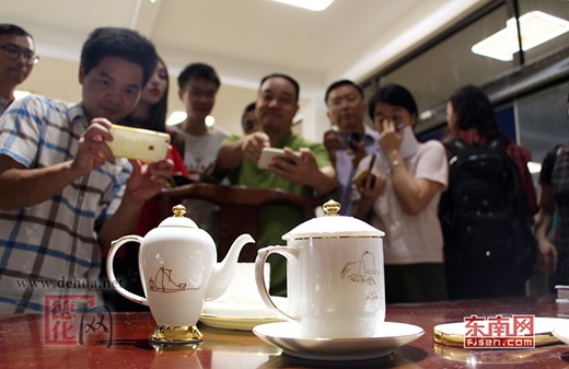 亮相金磚廈門會晤的德化陶瓷吸引了采訪團圍觀拍照。