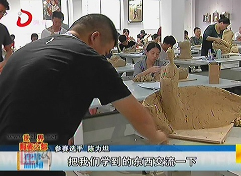 【同期聲 參賽選手陳為坦:因?yàn)閬磉@邊參加比賽可以互相學(xué)習(xí)、交流,能取長(zhǎng)補(bǔ)短,把我們學(xué)到的東西交流一下,后面能更好地把我們陶瓷文化更好地發(fā)揚(yáng)一下,我這個(gè)是以“一帶一路”為題材的,以我們?nèi)菸幕驗(yàn)槲覀內(nèi)菸幕催h(yuǎn)流長(zhǎng),因?yàn)槲艺麄(gè)設(shè)計(jì)是以一本書的形式來做,然后,我后面會(huì)以包括后面的一些處理,都是以一些我們?nèi)葸@邊的文化,因?yàn)椋菔呛I辖z綢之路的起點(diǎn),所以說選用這個(gè)題材!