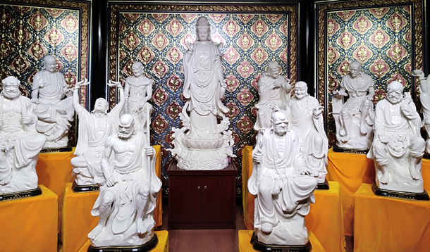 德化以白瓷著稱于世,但有一個(gè)缺陷:德化陶瓷無(wú)大器。過(guò)去德化燒制的沒(méi)超過(guò)50厘米。如何讓中國(guó)白瓷大型雕塑走向大雅之堂,促進(jìn)德化陶瓷業(yè)上升到一個(gè)新的歷史階段,這是邱雙炯一直夢(mèng)寐以求的心愿,日前,高達(dá)2.25米《三面千手觀音》在在國(guó)家博物館亮相。作品以佛教題材和內(nèi)涵,倡導(dǎo)慈悲、慈善、無(wú)敵、無(wú)畏的精神意境,采用“中國(guó)白”獨(dú)特的材質(zhì)燒制而成,在藝術(shù)表現(xiàn)上,增加旋轉(zhuǎn)的動(dòng)態(tài)功能,達(dá)到動(dòng)靜結(jié)合的表現(xiàn)力。作品比例勻稱,紋飾細(xì)膩,表情傳神,“千手”姿態(tài)各異,無(wú)一雷同,令人嘆為觀止。業(yè)界人士表示:“中國(guó)白”如此大體量瓷雕塑像,堪稱“世界瑰寶”。