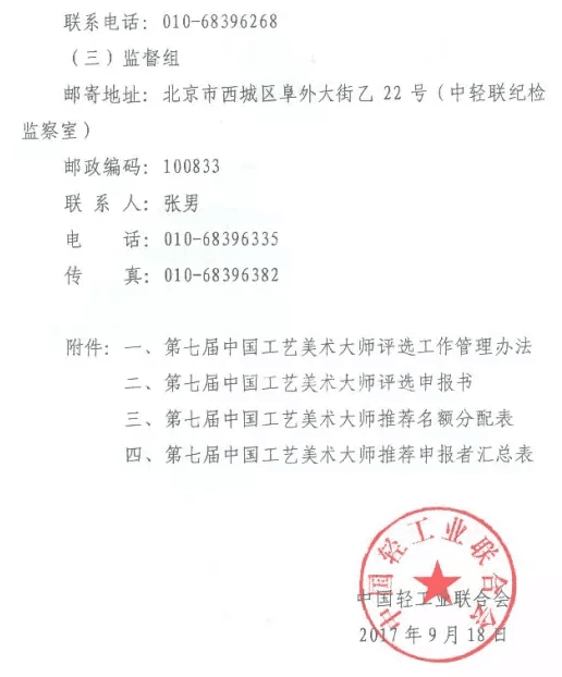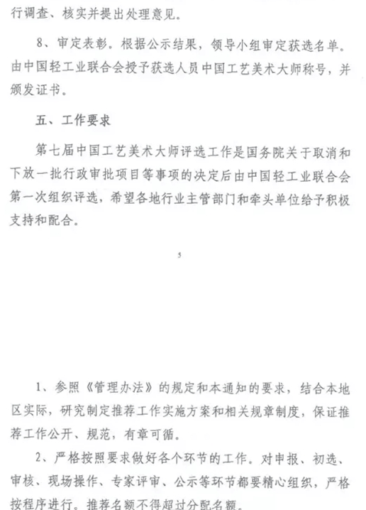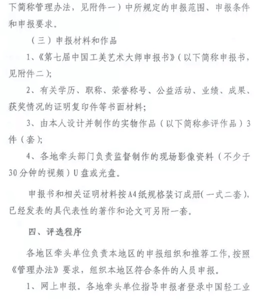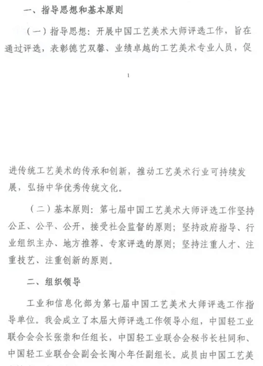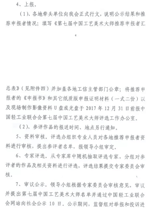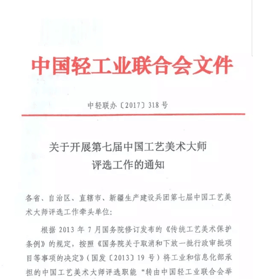 2017年9月18日,中國(guó)輕工業(yè)聯(lián)合發(fā)布關(guān)于開展第七屆中國(guó)工藝美術(shù)大師評(píng)選工作的工作,通知文件如下: