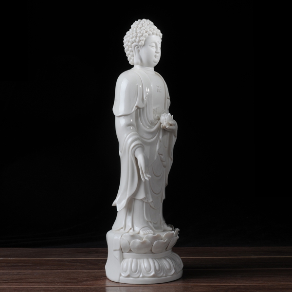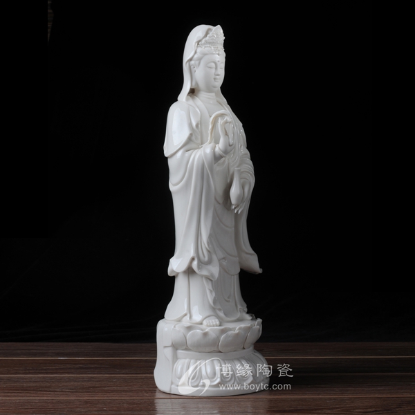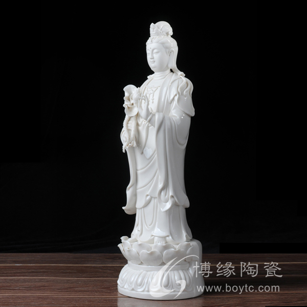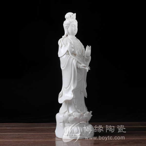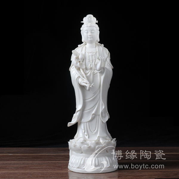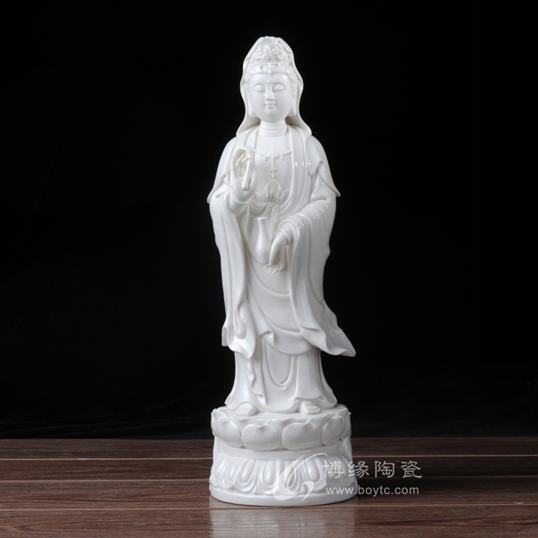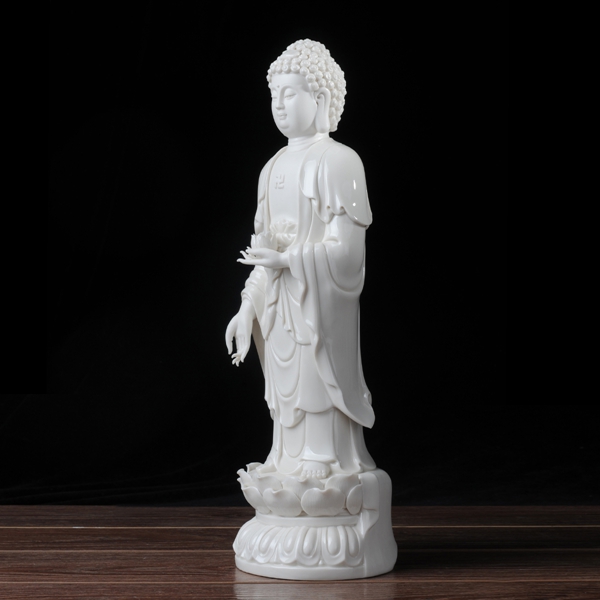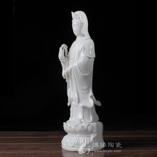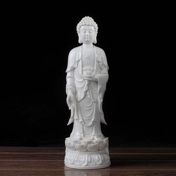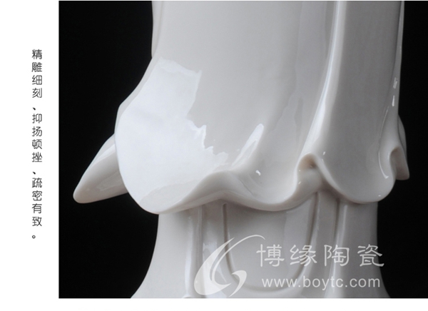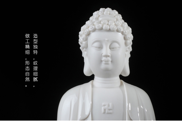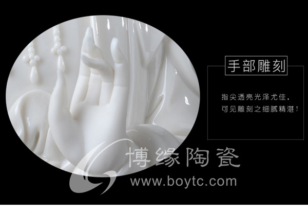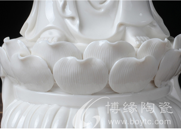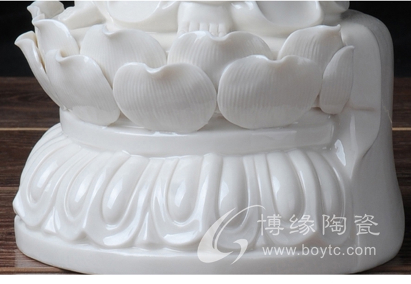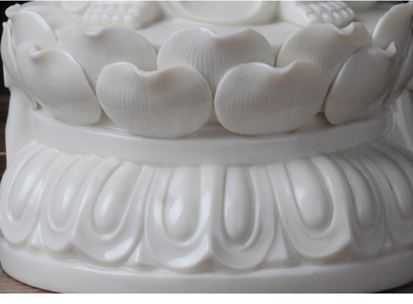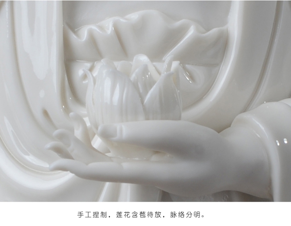作品西方三圣是以佛教凈土宗崇奉的造像題材,選自優(yōu)質(zhì)白瓷作為塑像材質(zhì),這三尊像皆立于仰蓮座上,各結(jié)不同手印顯示各自不同的宗教功用和身份。佛像下的臺座做成蓮花造型,池中水波蕩漾,盡顯其大愛無疆。