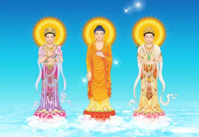 西方三圣又稱阿彌陀三尊,中間是阿彌陀佛,左邊觀世音菩薩,右邊大勢至菩薩組成。西方三圣乃是凈土宗專修對象。
