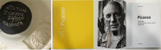 常見的底款 每一件畢加索陶瓷上,都留有底款和標記。有些作品底部有印章或記號,有些則在作品背面。在某些容器作品上,底款甚至在作品內(nèi)部。這些底款在不同系列中表現(xiàn)形式有不同,隨著年代推進,底款在形式上也有變化。 最常見的畢加索陶瓷底款一般寫著有如“Madoura Plein Feu”,“Edition Picasso”,“Empreinte Originale de Picasso”和“d’Après Picasso”的字樣。所有這樣的標記都表明作品是畢加索限量陶瓷原作。 2.畢加索陶瓷圖錄 畢加索陶瓷圖錄上清晰的記載了每件作品的“創(chuàng)作年份”。 這個年份標記了畢加索最初創(chuàng)作這款陶瓷的年份,但有可能并不是此款所有作品實際被制作出來的年份。 3.授權(quán)書 畢加索館藏級陶瓷作品證書由蘇富比、佳士得御用畢加索陶瓷專家——喬納森·納什先生鑒定后出具的證書具有學術(shù)上的權(quán)威性。 (曾任倫敦蘇富比,佳士得拍賣有限公司“畢加索陶瓷專場”資深顧問。現(xiàn)為美國LC藝廊畢加索陶瓷部門的研究專家。 1968年,喬納森隨父母移居法國南部蔚藍海岸的安提比斯,在那個時候,畢加索因為西班牙的內(nèi)戰(zhàn)和其他幾個藝術(shù)家移居到安提比斯,并在當?shù)氐鸟R杜拉陶瓷坊研究制陶工藝。)
